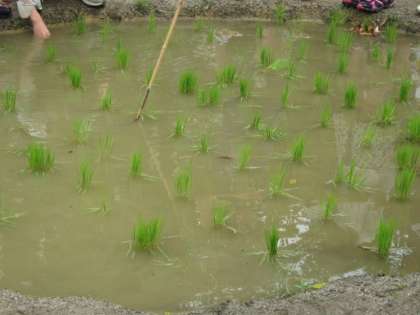 そして、台風が去った今日、「大丈夫だったかな・・・」一苗だけぷかぷか田んぼの中に浮いていましたが、他の苗はしっかり植わっていました。ホッとひと安心・・・風で入ってきた落ち葉を取って、台風が来る前の田んぼに戻りました。いや、台風に耐えて、少したくましく見える田んぼの苗でした。