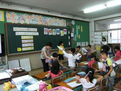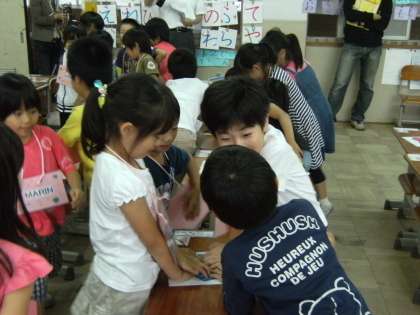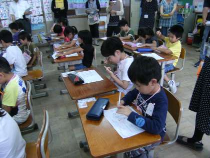 今回の授業は「“How are you?”「せかいでひとつのえほんをつくろう」という学習でした。色々な気持ちを表す英語の表現を何度も言って,楽しいゲームもしました。たくさんの先生の前でも,のびのびと学習できた素敵な1年生でした。