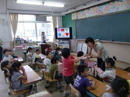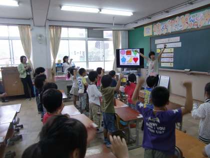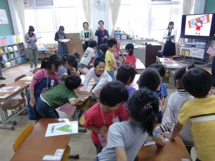 英語活動の授業研究会をしました。5時間目,1年2組の子どもたちが頑張りました。