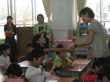 "Hello Song"の歌から始まり,name cardを先生からひとりずつもらいました。先生が ”Here you are”とカードを渡すと,みんな”Thank you.”と笑顔で答えることができていました。