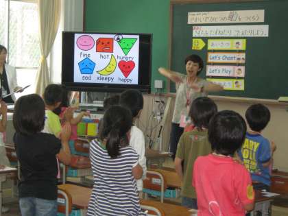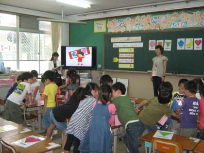 今日は,1年2組で英語活動の公開授業がありました。