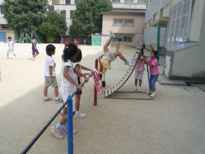 こんな場面を見かけました。体育の学習で練習した鉄棒の技を,休み時間に練習している姿です。