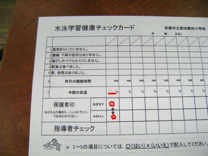 子どもたちが楽しみにしている水泳学習ですが,ご家庭でのチェックがないと,水泳学習に参加させることはできません。時々,今朝の体温を書き忘れていることもあります。また,「泳ぐ」・「泳がない」のどちらかにハンコかサインが必要です。今週は朝に雨が降っていたので保護者の方が水泳学習はないだろうと思いこんで,ハンコ(サイン)がなかったという場合もありました。天気のためにできなくなる場合もありますが,学習予定がある場合は,忘れずに検温・ハンコ(サイン)をお願いします。