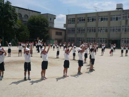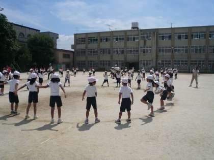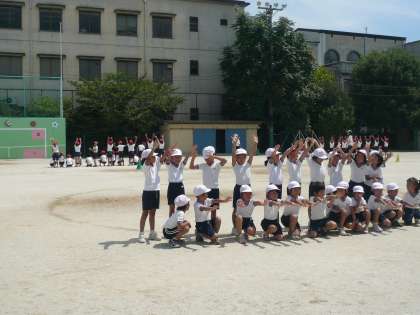 今日は,運動会の練習を運動場でしました。 1・2年生の団体演技(ダンス)「SHIKINボール1・2」の隊形の練習です。 大きな二重円から,小さな円に移動したり,最後のポーズを練習したりしました。暑かったけれど,みんながんばってできました。