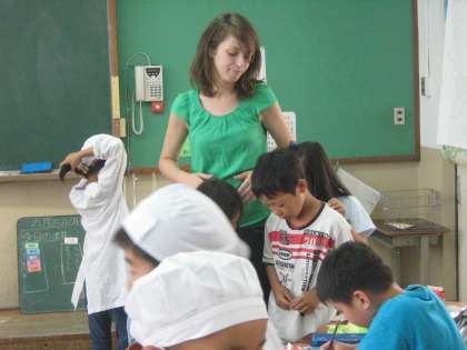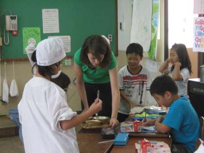 サラ先生は“How are you?"と子どもたち一人一人に声をかけられ,子どもたちも一生懸命“I'm fine."“I'm hungry."と英語でのやりとりをしていました。