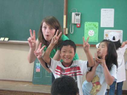 子どもたちは大喜びで,「こっち,こっち」「Hello!」とサラ先生を囲んでいました。