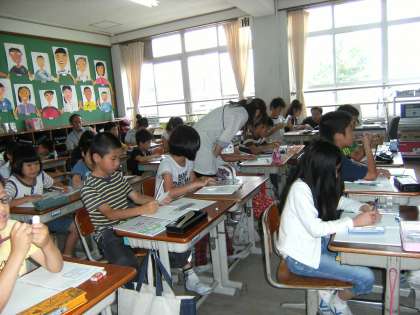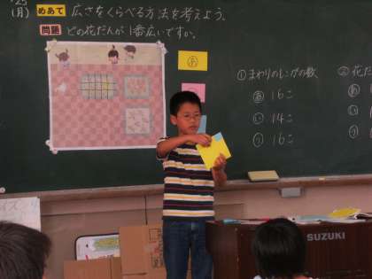 3つの花壇があり,どの花壇が一番広いかを考えました。同じ広さのマス目がいくつ分あるかで比べることに,友達の考えを聞いて気づくことができました。