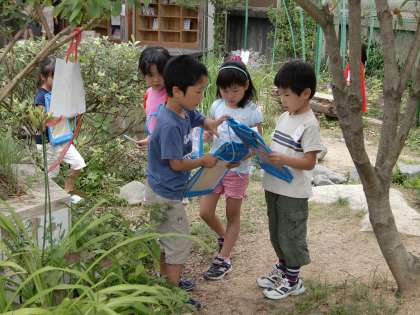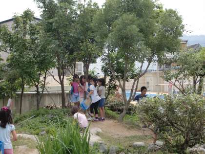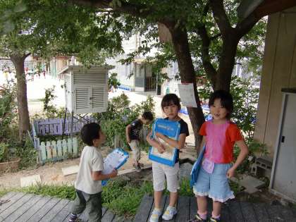 写真は『クイズラリー』の問題を解きながらビオトープにやってきた1年生たち。声に出して問題を読んでいるのですが,何ともあやしい読み方です。とりあえず,「問題の意味,分かってんのかな?」