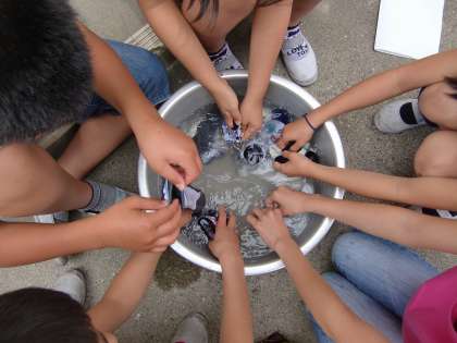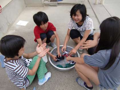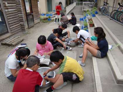 6年生が今日自分がはいてきた靴下を手洗いしました。家庭科の勉強です。