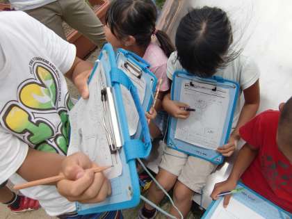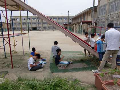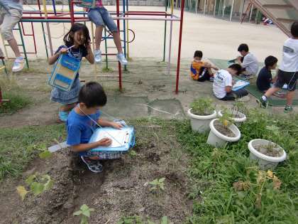 4時間目,3年生がビオトープで学習しています。ヒマワリの成長を観察しているようです。観察シートにヒマワリの絵を描いています。