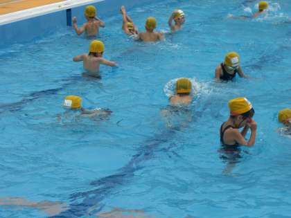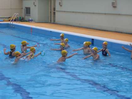 リレー遊びやだるま浮きなどをしました。これまでにやったことのある石ひろいも水位が高くなるとなかなか難しいようで,「顔つけな取れへんなぁ。」「なかなか届かへん。」との声も聞かれました。終わってから水泳がんばりカードに色を塗るのを楽しみにしている子もたくさんいます。