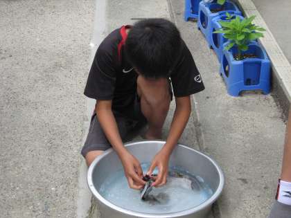 家庭科の実習で,洗濯(手洗い)と服のたたみ方をしました。手洗いの経験は,ほとんどないと子どもたちも言っていました。今の世の中ボタンをピッと押せばきれいにしてくれます。だからこそ,手洗いの苦労や汚れが落ちていくのを実感でき,楽しめたと思います。
