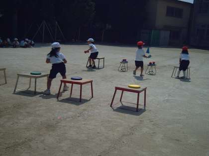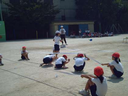 今日の練習では,初めてチャレンジ走(障害物走)の練習をしました。マットで前転してスタート。フープをくぐったり,とんだりします。ゴール前,玉を置き換えるのを慌ててしまってはいけません・・・慎重に!かつスピードをおとさずに!!!がんばれ!1年生!!