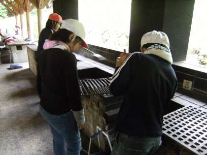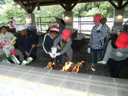 牛乳パックを使ってどうやってパンを焼くんだろう??ずっと疑問に思っていた子どもたち。ようやく作り方が分かったようです。パンの中に具をはさんで,できたものをアルミにくるんで,牛乳パックの中に入れてかまどにセットし,あとは火をつけるだけ。