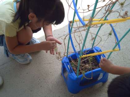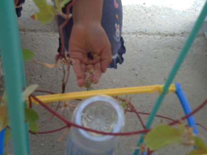 春から育てているあさがおですが,夏の間たくさんの美しい花を咲かせて私たちの目を楽しませてくれました。まだまだ咲き続けていますが,今日は生活の時間に種取りをしました。花が咲いた後に実ができ,最初は黄緑色だったのが茶色になると種のとりごろだということになり早速観察しました。「みっつのおへやにわかれている」「おへやにたねが2つぶづつはいっていた」ということを発見していました。