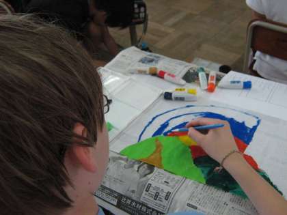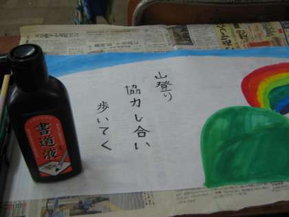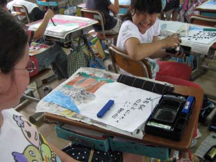 5年生が図工で絵手紙風に山の家の思い出をまとめていました。国語で学習した俳句を元に,その句に合う絵を描いていました。和紙に描くので,滲みをうまく使いながら,素敵な作品に仕上がっていました。