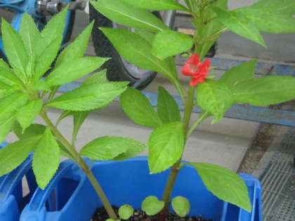 ホウセンカがぐんぐん大きくなっています。そして,ついに花が咲きました。一番大きく育っていたものが一番に花が咲くかと思いきや,それは違うのですね。背丈が小さくても咲く時が来たら,咲くのです・・・