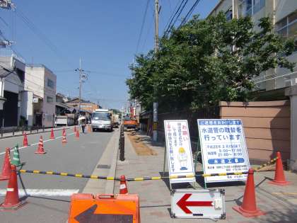 ただ今,東一条通りで水道管工事を行っています。川端通りから東山通りに向けて西から順に進めています。今日はいよいよ本校の正門の西側まで来ました。歩道を掘り返しています。