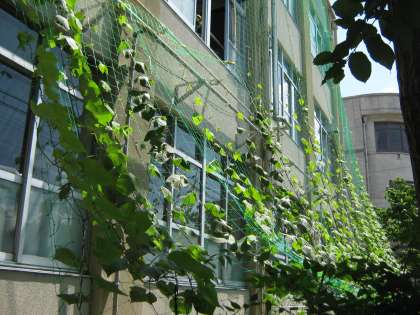 この週末に,みどりのカーテンがよく伸びました。今日,2階の4年1組の教室から見ると良くわかりました。