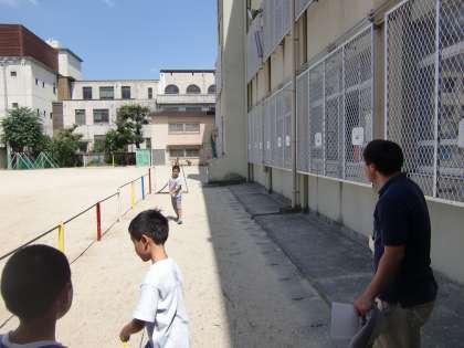 5時間目,メジャーを持って4年生が校舎から出てきました。聞くと,運動場の面積を測るということです。少し遅れて出てきた子たちも渡り廊下や体育館の長さを測って面積を計算していました。