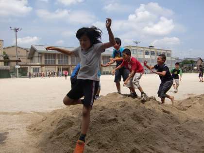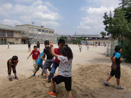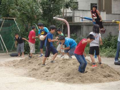 写真は中間休みに砂の山に登って遊ぶ子どもたちです。普段は砂場で遊ぶことなどまずない子どもたちですが,