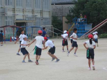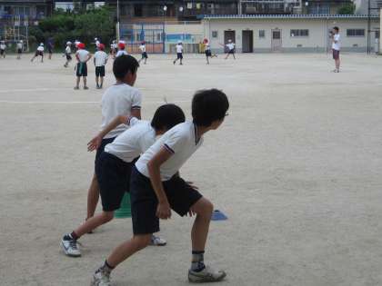 じっとしているだけでも暑い夏がやってきました。そんな中、陸上部の子どもたちは走りまくっています。写真は、しっぽ取りのゲームで走っている子どもたちや、30秒間走で走っている子どもたちです。6年生の子どもたちが走る姿は迫力があり、顔つきも凛々しく、なかなかかっこいいです。