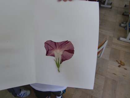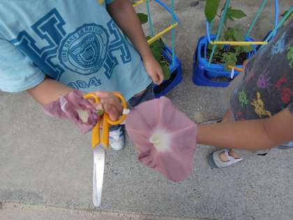 1年生の子がハサミを持ってアサガオの植木鉢のところに行きます。そして,見事に咲いたアサガオの花を持ってきたハサミでチョキン!