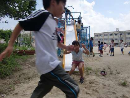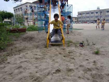すべり台すべりの記念写真です。3枚目,そんなとこ横切っちゃ危ないよね。