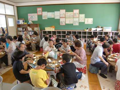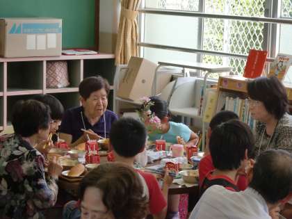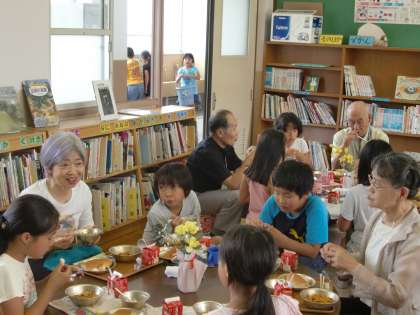 私は下の給食室で各学年の子どもたちが給食を取りに来るのを見ていました。時計を気にしながら,そろそろわくわくルームの準備が終わったころかな? 間もなく「いただきます」かな? と思って部屋に行くと,もうすでに食べ始めていて,しかも,子どもたちと高齢者の皆さんとが打ち解けた感じでとても和やかな雰囲気が漂っていました。