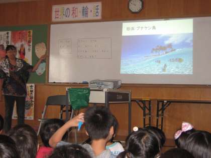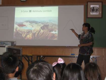 インドネシアの国の地図や自然の様子,めずらしい生き物などをコンピュータの画像を見せながら,英語でお話ししてくださいました。