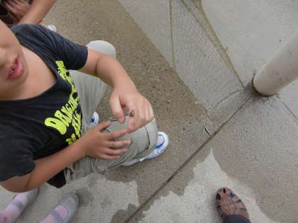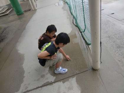 同じく中間休みの渡り廊下。3年生の子が小さな水たまりで何かしています。