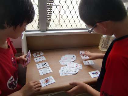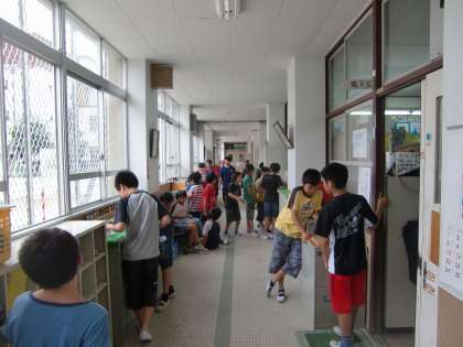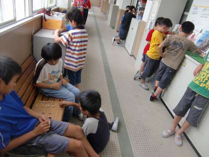 雨が降って外で遊べない日の職員室前廊下は,将棋,オセロ,トランプなどの雨用の遊びをする子でいっぱいです。