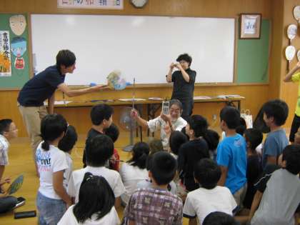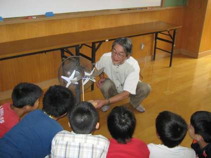 平瀬先生は,風力発電をおこす風車や微風でも揺れるモビールの実物を見せながらお話くださいました。風力計で実際にどれくらいの電気が起こっているのか,子ども達は興味津々に見ていました。