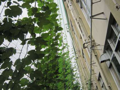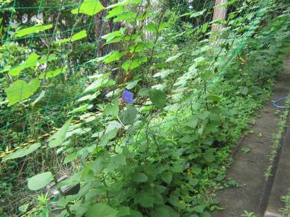 緑のカーテンに最初の花が咲きました。花の色は深い青色で、とても美しく咲きました。つるもどんどん大きくなり、2階に届くつるがたくさんになりました。まだまだ緑のカーテンとしては隙間だらけですが、花が咲くとうれしくなります。
