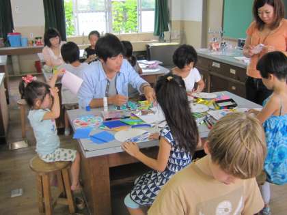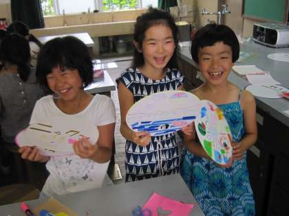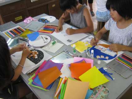 今日のサタデースクールは、「うちわづくり」でした。丸いうちわに、思い思いの絵を描いて、楽しい作品をつくっていました。中には、2つ以上つくった子どももいました。色紙を切り絵のようにしてつくった子どももいました。出来上がった作品で、涼しくエコに過ごしたいものです。