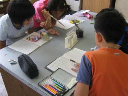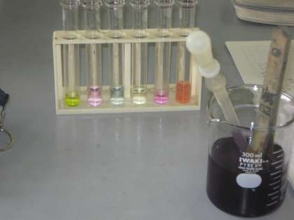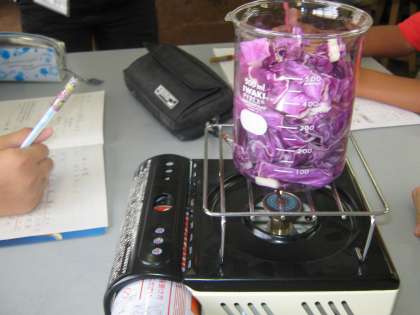 理科の「水溶液の性質」の単元で,ムラサキキャベツをつかって塩酸,水酸化ナトリウムなどの水溶液を区別しました。ムラサキキャベツをゆがき,煮汁を作りました。10種類の水溶液を用意した中から各グループ6種類選びました。そこにムラサキキャベツの煮汁を数滴ずつたらしていきます。とても奇麗な色に変わりました。酸性とアルカリ性に区別していきますが,それぞれの水溶液のPHによって,カラフルな色になりました。紫キャベツで試薬が作れること,それぞれの水溶液が微妙にPHが違うことが一目で見て分かり,子どもたちは感動していました。