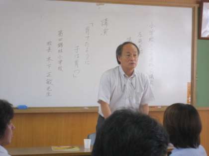 今日の研修は、本校の木下校長先生の講演「育てたように子は育つ」です。本校のPTA会長の進行で研修会は進みました。