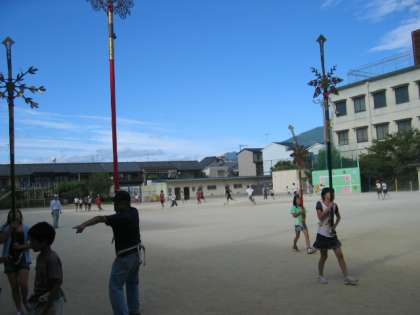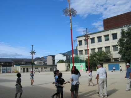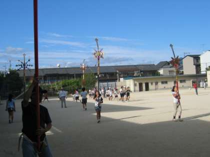 練習後には,その「今宮祭り」参加に向けての案内と,昨年度から参加している「京大 中央キャンパス祭09」の案内を配りました。休日や金曜日の夕方に行う祭りですので,保護者の方にも,日程の調整や当日の送り迎え等いろいろとご協力をいただきながらの参加となります。また,地域の指導者の方には,指導はもちろんのこと,使用する鉾や法被(はっぴ)の準備・運搬・搬出等でもお世話になります。みんなで,力を合わせて町の大切な祭りを成功させたいと思っています。