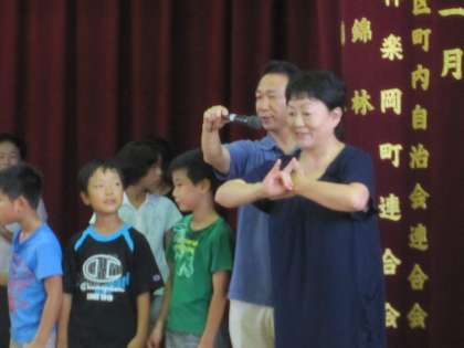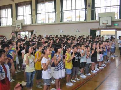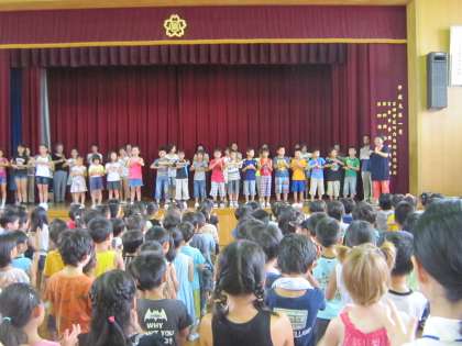 今日の朝は、全校の児童が体育館に集まりました。吉田民生児童委員のみなさんが、全校の子どもたちに手話による「世界中の子どもたちが」と「ビリーブ」の2曲を教えてくださいました。夏まつり実行委員会の子どもたちも舞台に立ち、手話のお手本をみんなの前で示してくれました。24日の朝会でもう1度練習する予定です。