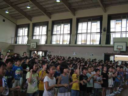 民生児童委員の皆さんと夏まつり子ども実行委員がステージの上でお手本となり,手話の練習を行いました。「世界中の子どもたちが」「BELIEVE」の2曲です。1年生もしっかりと覚えてくれました。