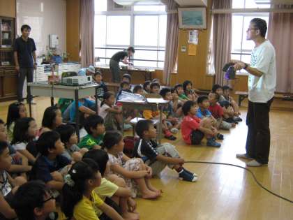 「クマゼミ」「アブラゼミ」「ツクツクボウシ」「ヒグラシ」「ニイニイゼミ」「ミンミンゼミ」・・・先生に「よく知っていますね」「そんなのも知ってるの」などと言っていただきうれしくなった3年生。昆虫クイズにも積極的に答えていくと,またまた「さすが3年生はちがうね」なんてほめていただき,ますます絶好調になりました。
