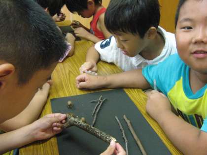 こんなふうに,楽しくセミのお話を聞いた後,実際に枯れ枝に産みつけられた卵に水をかけて「雨が降った」ことにして,たまごから幼虫が出てくるところを観察しました。
