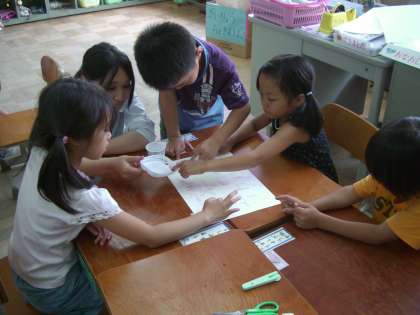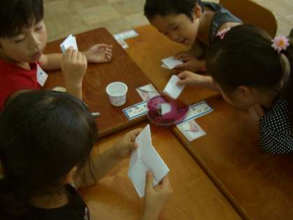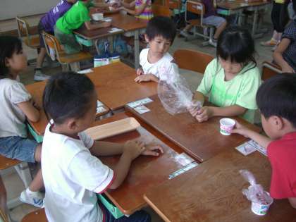 色染めをしました。これまで集めていた咲き終わったあさがおの花から色水を作り,和紙を染めたり,絵を描いたりしました。「わぁ,めっちゃきれい!」「こんな模様になった!」と子どもたちは大喜び。今度は,この和紙を使って作品を作ります。色水作りのためにあさがおを持たせていただき,ありがとうございました。
