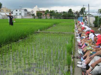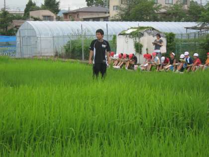京大農学部の田んぼが約3m四方ぐらいで区切られていて,稲の高さがまちまちです。その訳はなぜなのか,観察することでよけいに疑問も浮かんできます。肥料が違うのかな,植えた時期が違うのかな,それぞれの区画に記号のような数字の書かれた木の札もささっています。みんなで集まって,質問タイムを設けてもらいました。