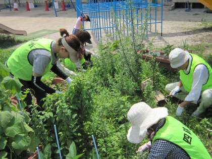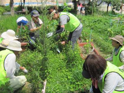 今日も暑い日でしたが、ビオトープの園芸作業を行っていただきました。