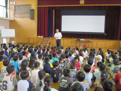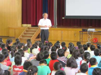 夏休み前の学校朝会を行いました。校長先生の話では、まず、夏休みに事故なく、けがなく、病気をしないで楽しく過ごしてほしいことと、4年に一度のオリンピックでがんばる人たちを見てほしいことが話されました。