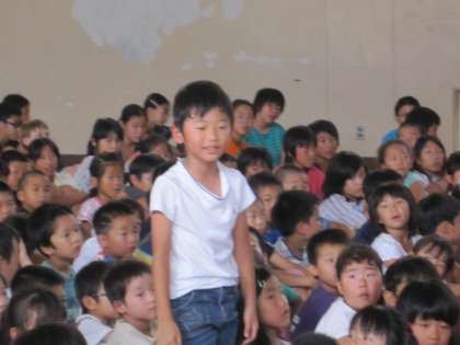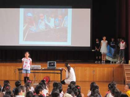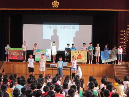 1年1組に引き続き4年1組が発表しました。4年生は、6月に行った「みさきの家」の出来事を中心に4人の子どもたちが発表してくれました。