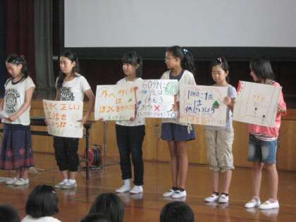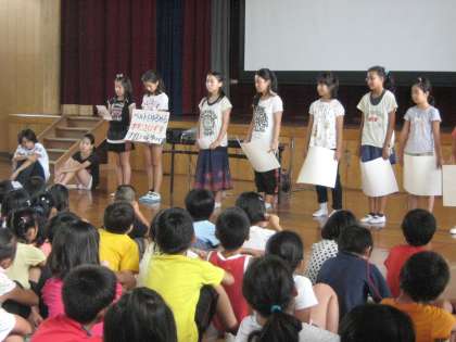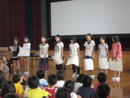 どのような時に熱中症になりやすいか,どのようなことに気をつければ防げるのかを発表しました。そして,最後にクイズ形式でみんなに問いかけ,理解がさらに深まるように工夫していました。昨日の練習の成果が生きて,聞こえやすい声での発表ができていました。