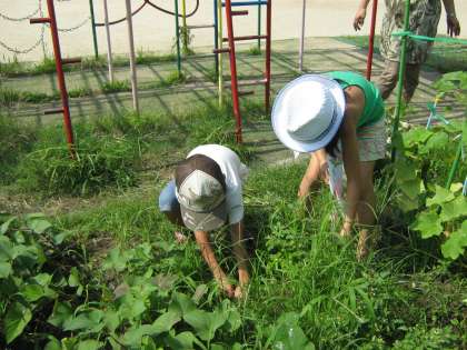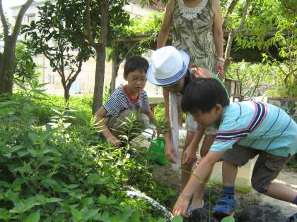 2年生は,畑の水やりの後は雑草を引きます。次に雑草をビオトープの隅に片付けます。そうすると,ビオトープの井戸から水が出ていて,みんなで,手や顔を洗いました。「冷たーい」思わず声が出ます。これからも水やりをがんばってね。