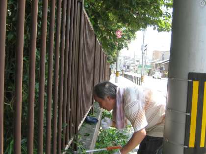 校長先生が率先して,炎天下のもと,学校から歩道側へ出ている枝を刈り取って下さいました。明日の夏まつりに来てくださる方をお迎えする準備もOKです。